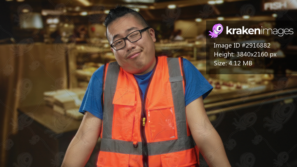 Man in orange reflective vest smiles and shrugs shoulders inside a restaurant building, standing at counter; bemused patience.