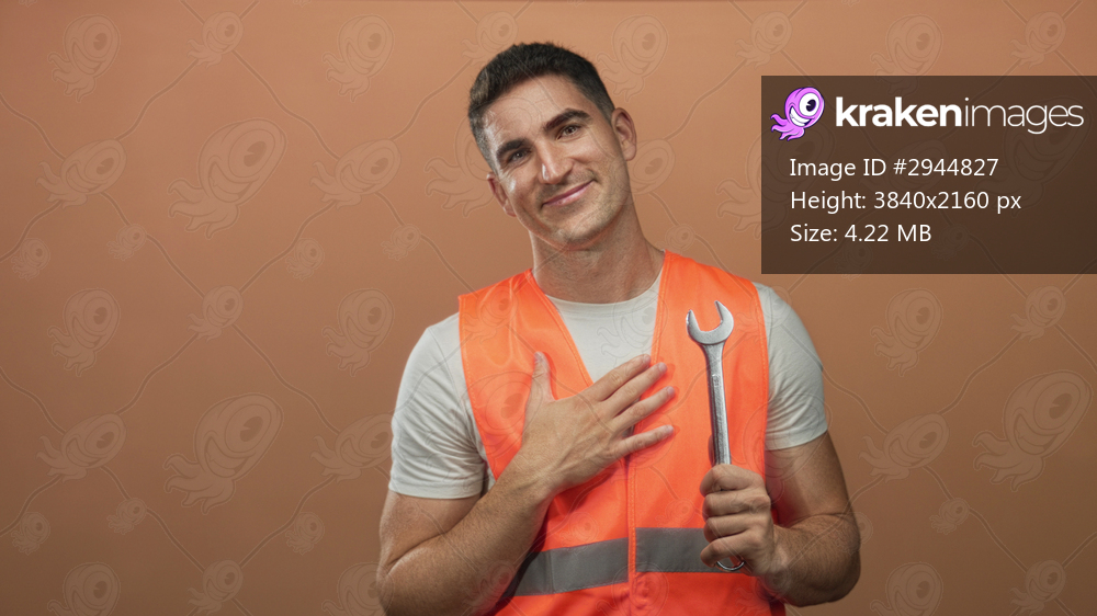 Man in orange safety vest holding wrench with right hand while left hand rests on chest in peach studio; simple gratitude.