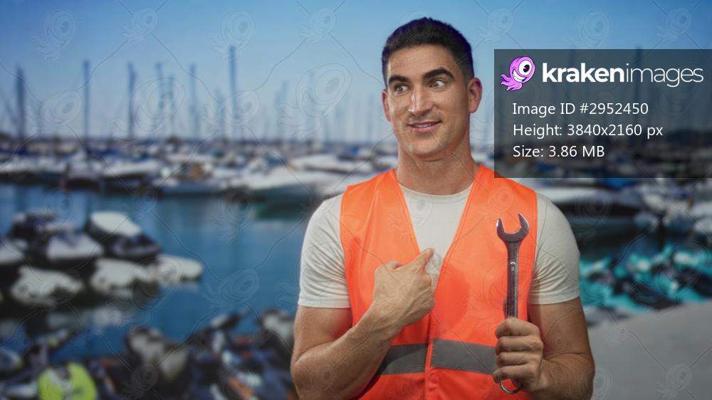 Man in orange safety vest points finger to chest holding wrench at port marina with boats and jet skis nearby; pride duty.