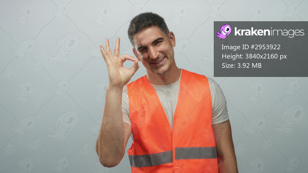 Man in orange safety vest showing ok hand gesture in gray studio; confidence safety teamwork reliability.