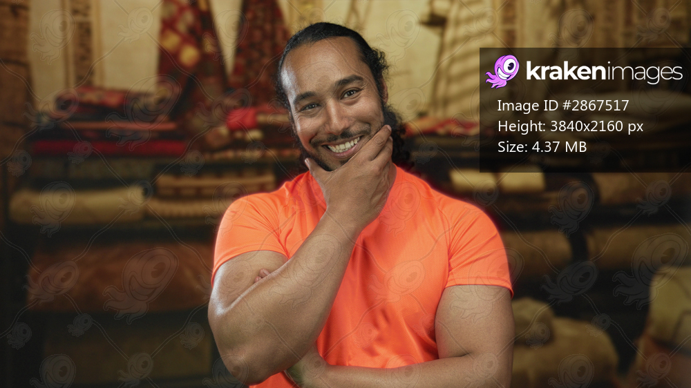 Man in orange shirt hand on chin smiling in carpet shop surrounded by rolled rugs and stacked carpets, arms folded; contemplation thoughtful.