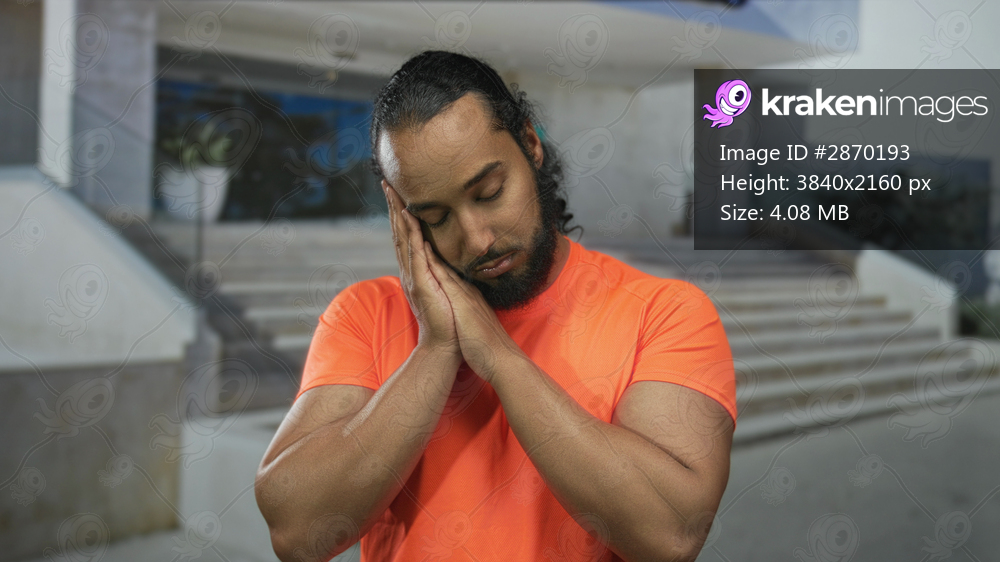 Man in orange shirt resting head on hands at building steps with closed eyes and bowed posture; tired.