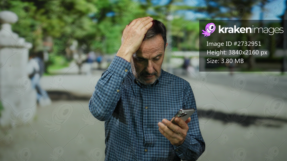 Man in park with smartphone appearing stressed or worried in an outdoor setting.