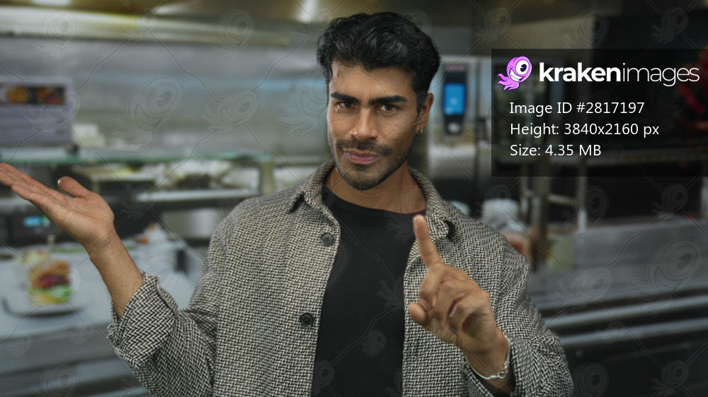 Man in patterned coat holds out hand with open palm in kitchen with counters and appliances; confusion doubt uncertainty hesitation.