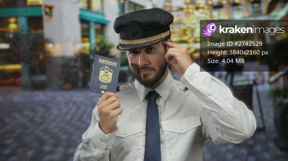 Man in pilot uniform holding a united arab emirates passport outdoors in a busy urban street setting.