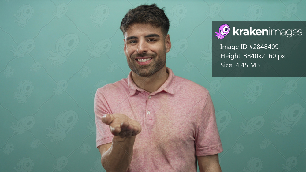 Man in pink polo shirt gently blows a kiss with hand extended in a turquoise studio setting; affection.