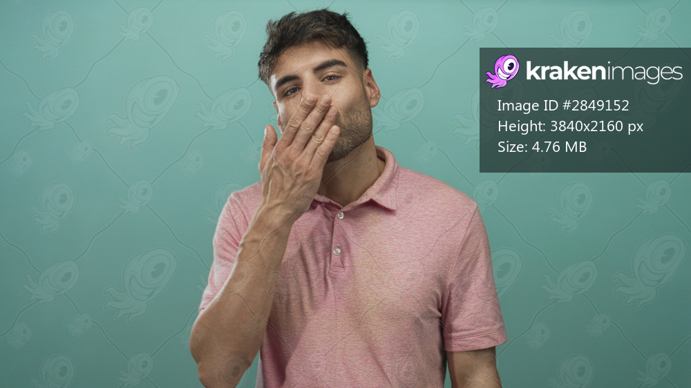 Man in pink polo shirt gently blows a kiss with hand extended in a turquoise studio setting; affection.