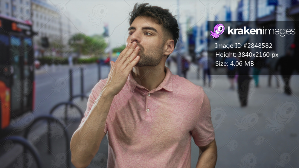 Man in pink shirt blowing a kiss with hand near mouth on sunny busy city street; greeting affection.