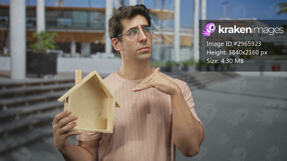 Man in pink shirt holding a wooden house model with pinched nose gesture and closed eyes near modern building steps and planters; doubt.