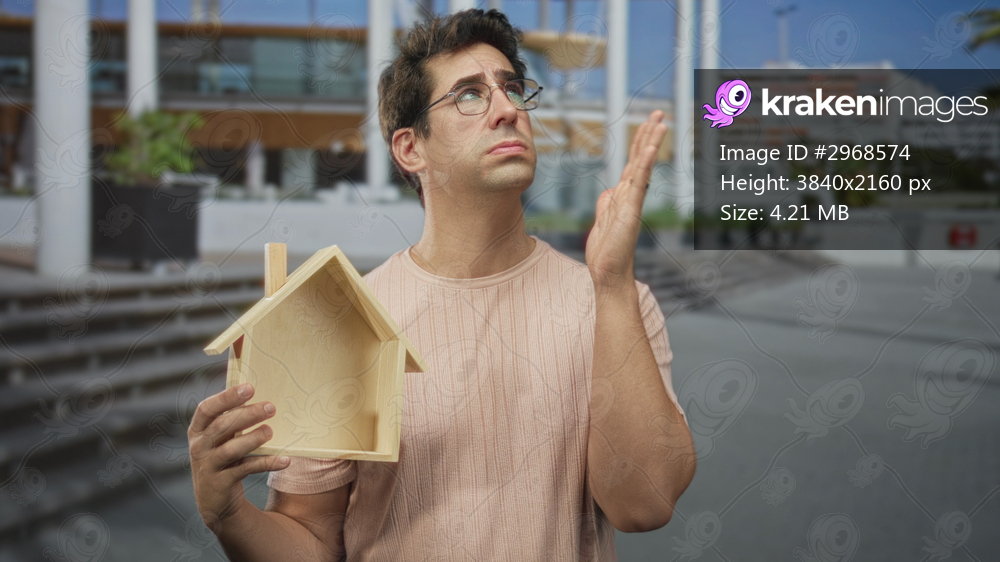 Man in pink shirt holding a wooden house model with pinched nose gesture and closed eyes near modern building steps and planters; doubt.
