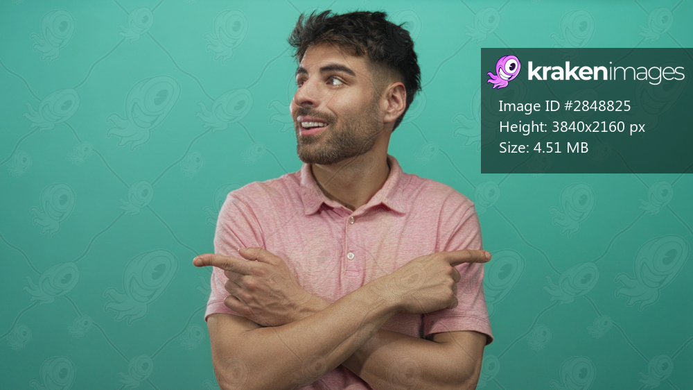 Man in pink shirt pointing fingers both directions in studio with turquoise backdrop and smiling expression; choice uncertainty.