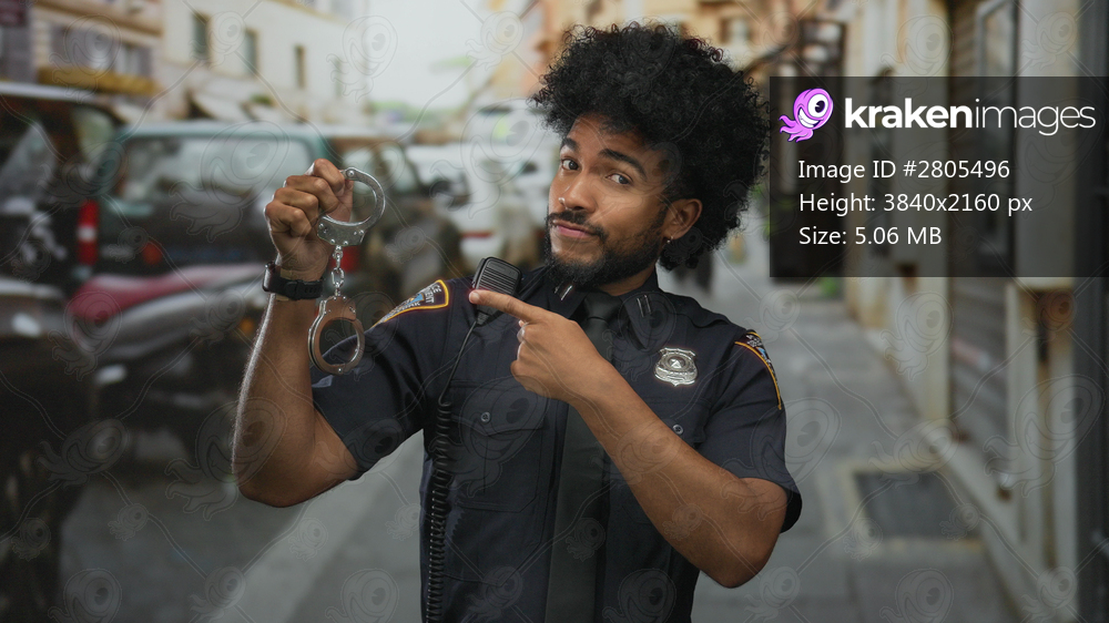 Man in police uniform holding handcuffs stands confidently on a bustling city street reflecting authority and duty