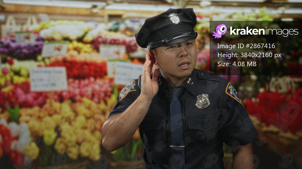 Man in police uniform holds hand to ear listening in street flower market stall amid rows of tulips; vigilance focus security duty.