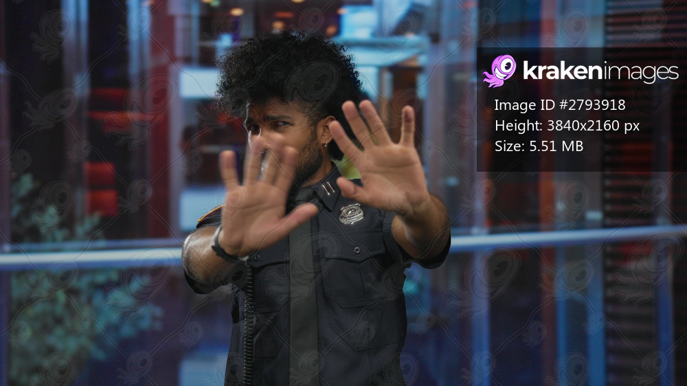 Man in police uniform inside a hotel making stop gesture with both hands against a blurred indoor background.