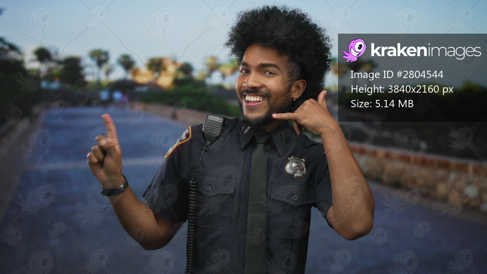 Man in police uniform outdoors gestures fun with call me sign on a sunny city street, adding a playful touch to urban enforcement.