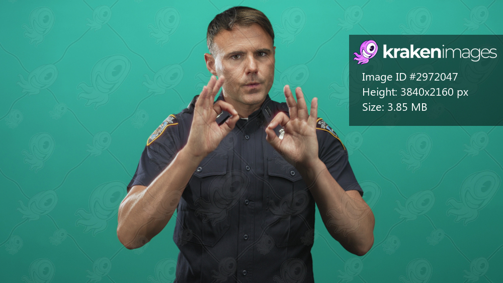 Man in police uniform with visible badge makes ok sign with both hands against green studio backdrop; calm focus.