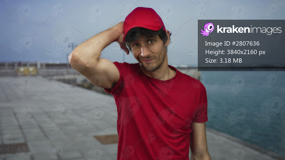 Man in red baseball cap and matching red shirt holds hand behind head on concrete seaside promenade; uncertainty.
