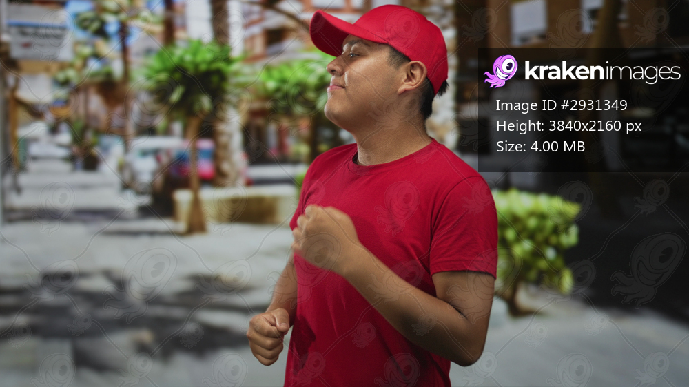 Man in red cap clenches fists on a busy city street with blurred buildings and palm trees; determination resilience purpose.