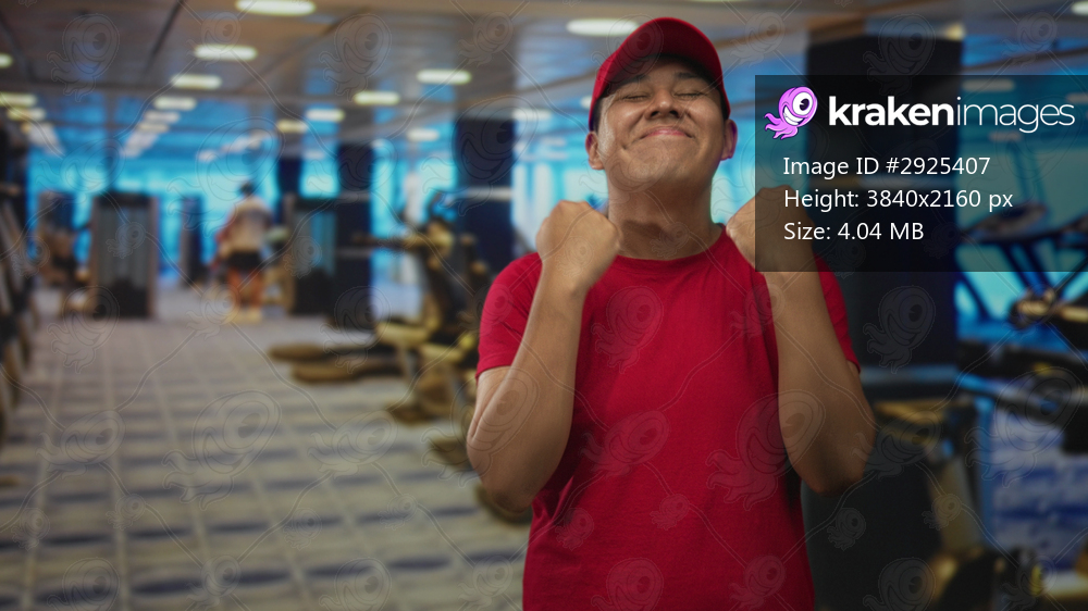 Man in red cap clenches fists and smiles in a gym building by treadmills and weight machines; pride celebration.