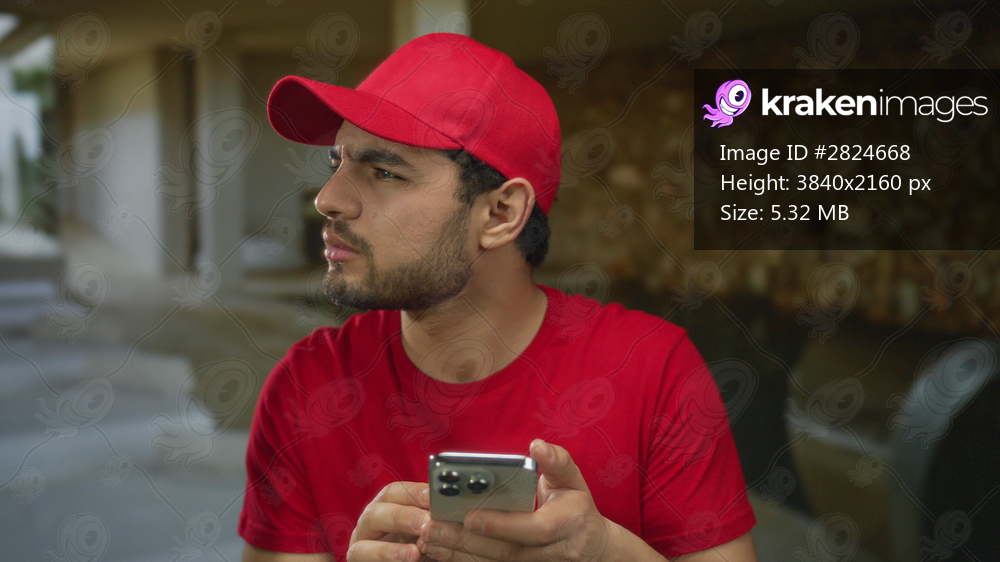 Man in red cap frowns and holds smartphone with both hands while leaning forward slightly in spa building; uncertainty.
