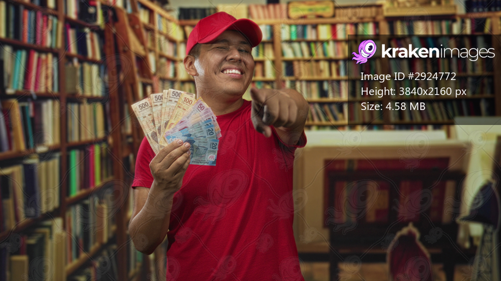 Man in red cap holding a fan of pesos and pointing finger toward camera in old library; confidence success.