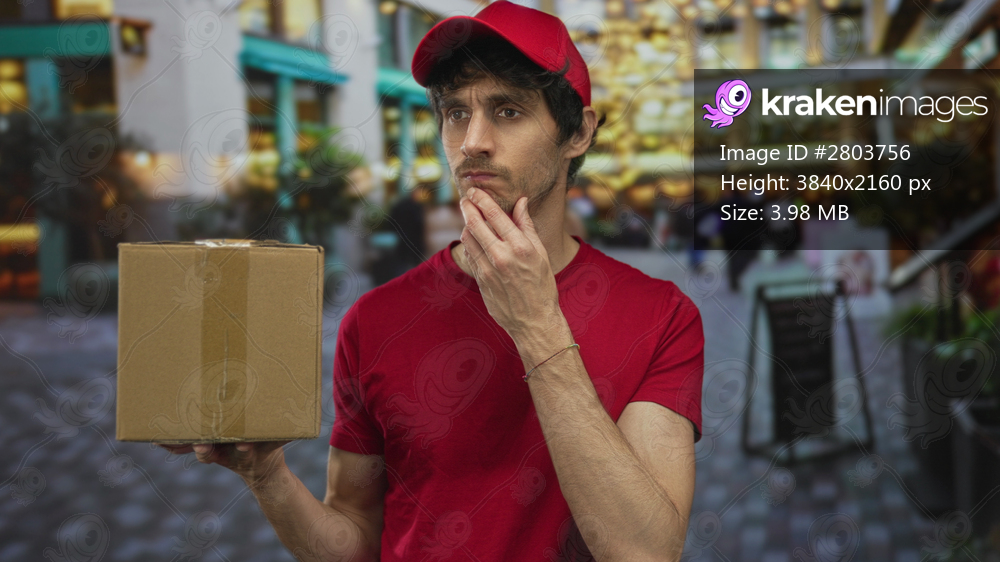 Man in red cap holding cardboard box and touching chin on busy city street; uncertainty and hesitation.