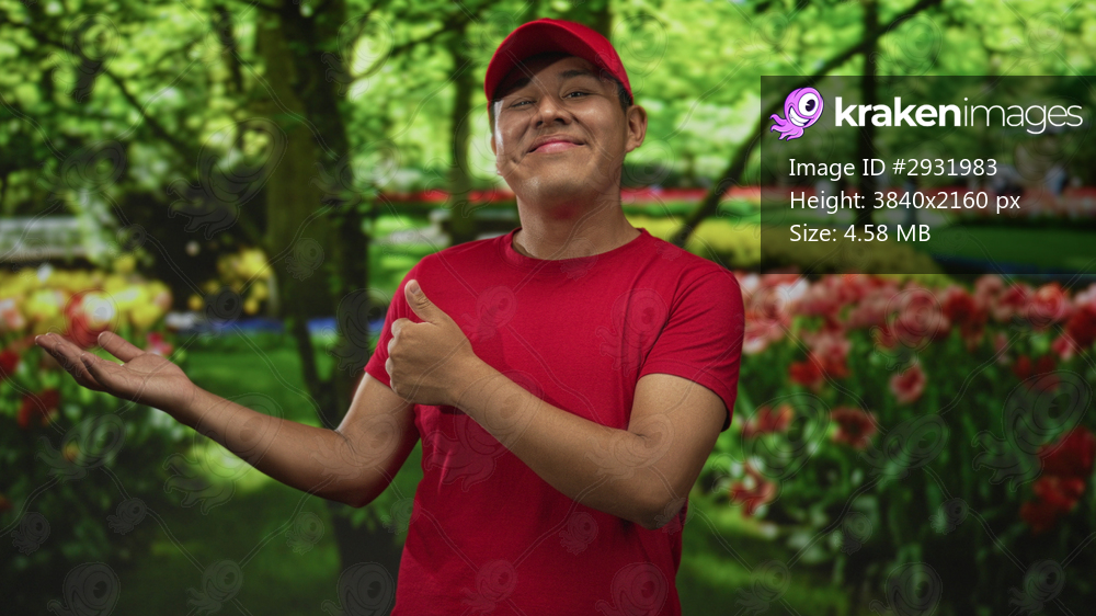 Man in red cap pointing finger and showing open palm in forest park with green trees and tulips; cheerful service.