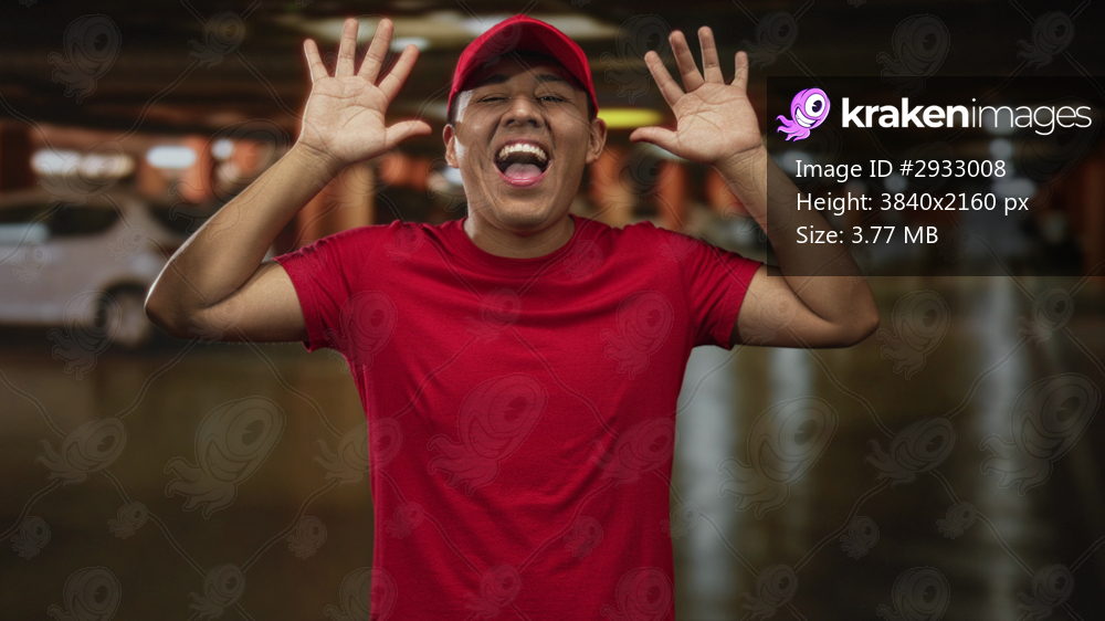 Man in red cap and red shirt with hands raised and tongue out in a parking building; playful mischief.