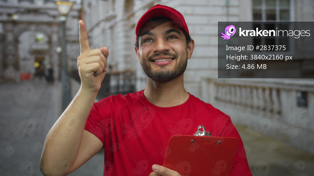 Man in red cap and red shirt holding a clipboard and pointing finger upward on a city street near a stone building facade; optimism.