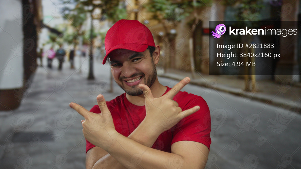 Man in red cap and red shirt makes rock horns gesture with crossed arms on city street lined with buildings; fun rebellion.
