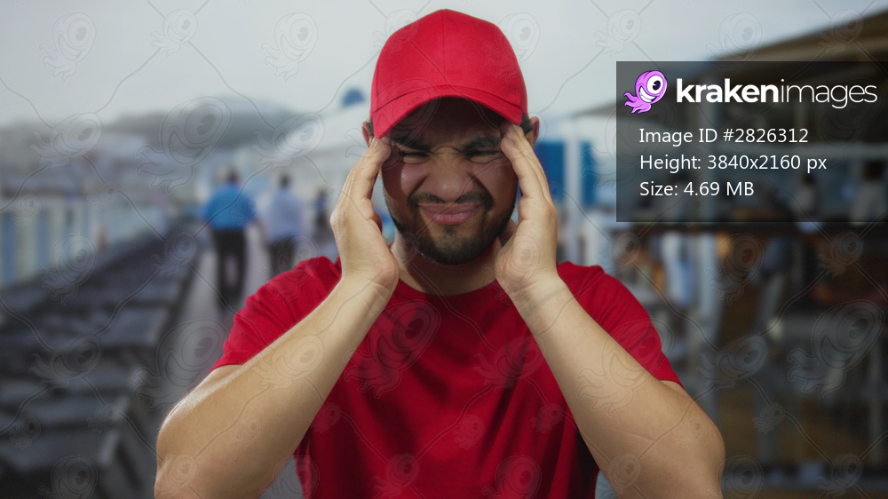 Man in red cap and shirt clutching his temples for headache on a cruise ship deck street by railings; stress.