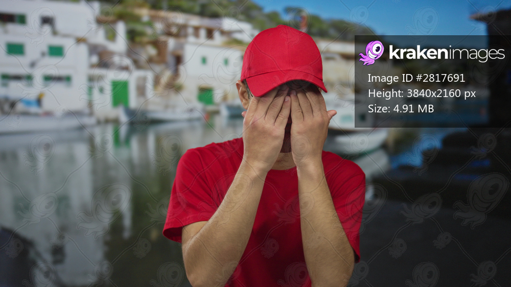 Man in red cap and shirt covers eyes with hands beside docked boat at port on sunny street while smiling broadly; surprise.
