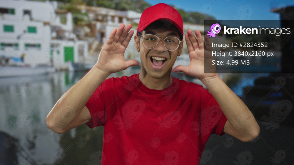 Man in red cap and shirt covers eyes with hands beside docked boat at port on sunny street while smiling broadly; surprise.