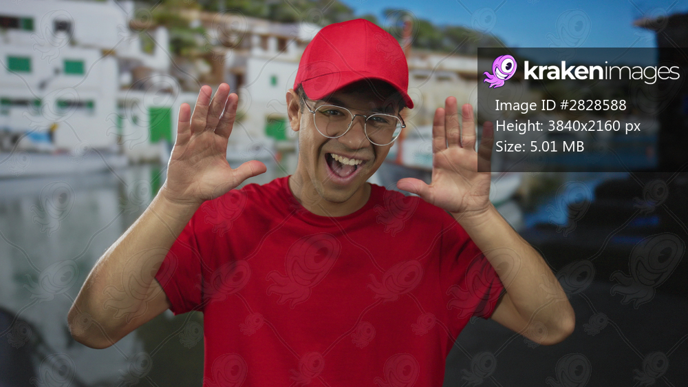 Man in red cap and shirt covers eyes with hands beside docked boat at port on sunny street while smiling broadly; surprise.