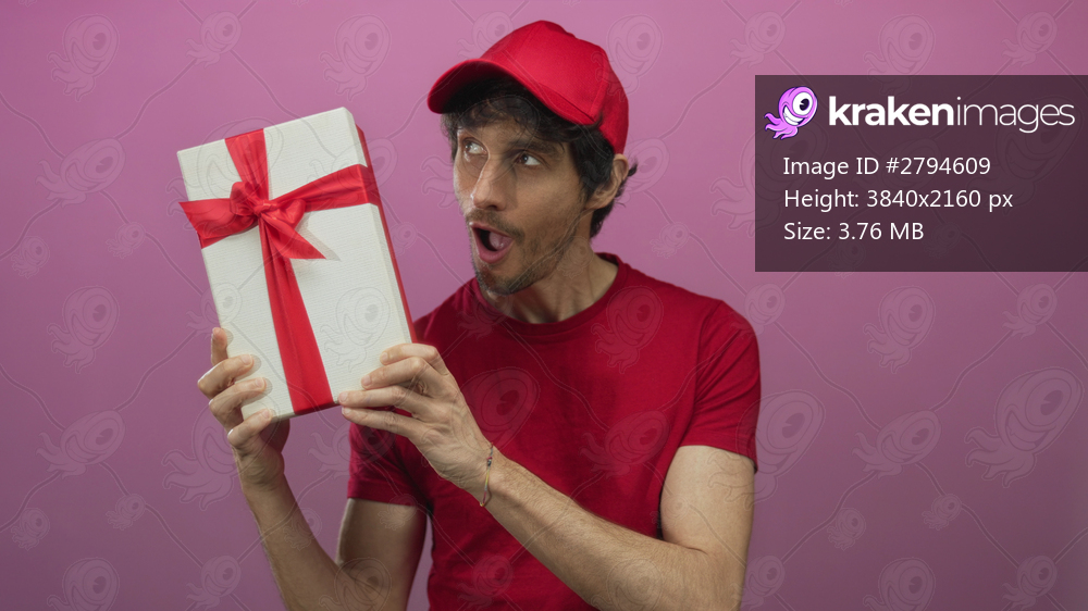 Man in red cap and shirt holds large white giftbox with red ribbon and opens mouth in pink studio; surprise.