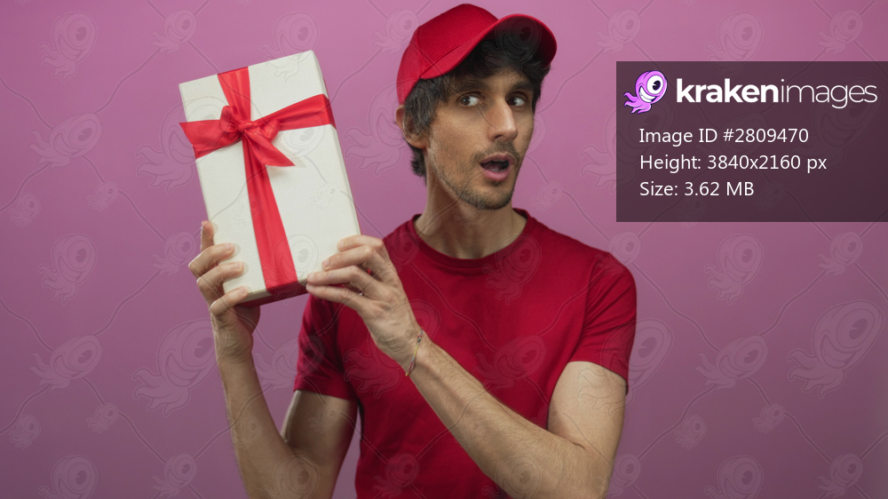 Man in red cap and shirt holds large white giftbox with red ribbon and opens mouth in pink studio; surprise.