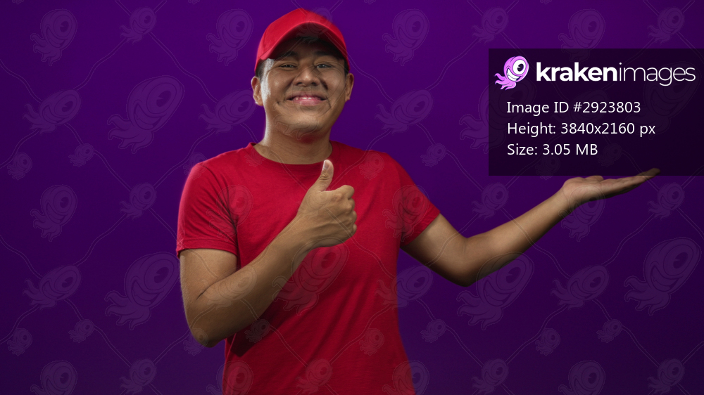 Man in red cap and shirt presenting palm and pointing with hand in purple studio; friendly approval.