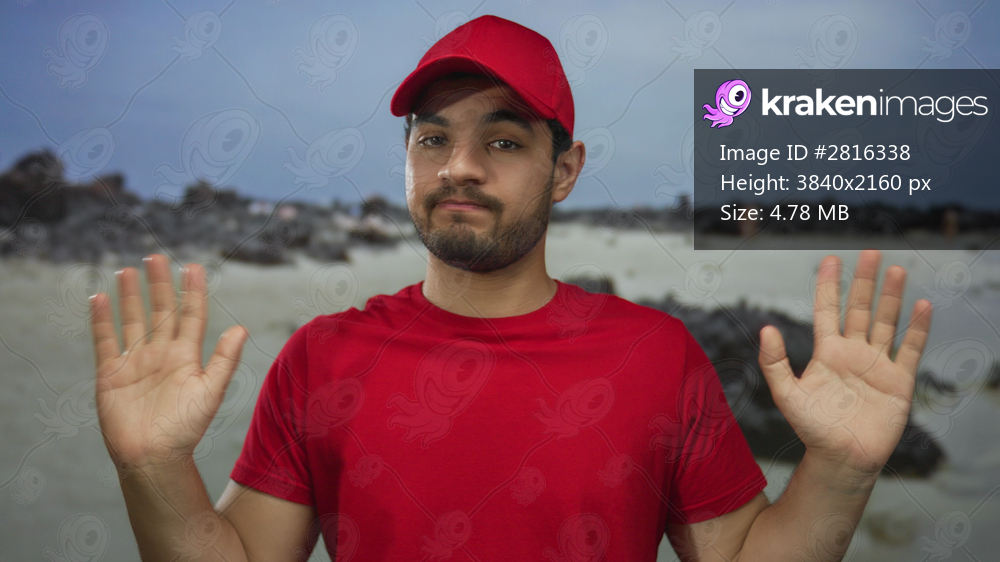 Man in red cap and shirt raises palms on sandy beach with rocky shoreline under pale blue sky; uncertainty.