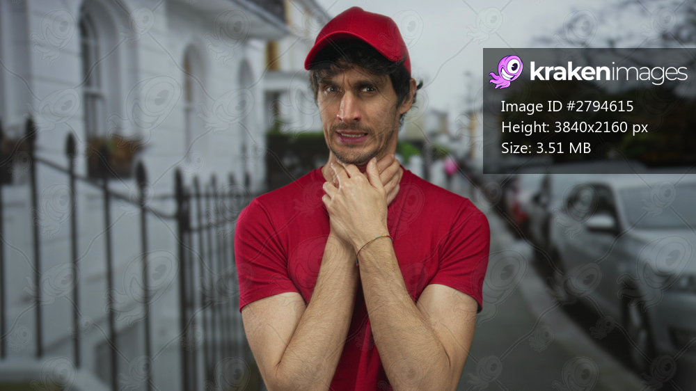 Man in red delivery uniform clutches neck in choking gesture on city street amid parked cars during daytime; panic.