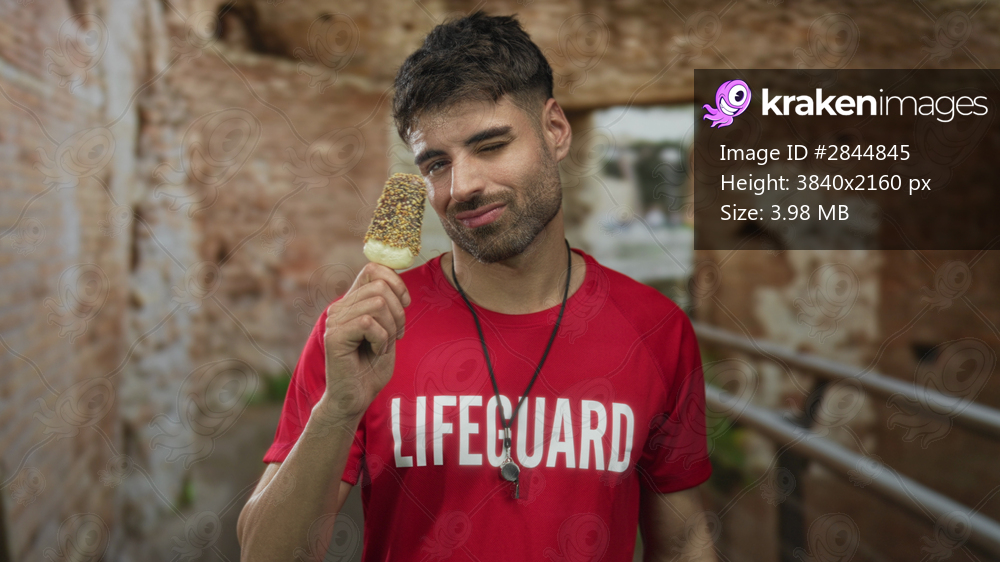 Man in red lifeguard shirt holds icecream covered in nuts at roman ruins outdoors; relaxation indulgence.