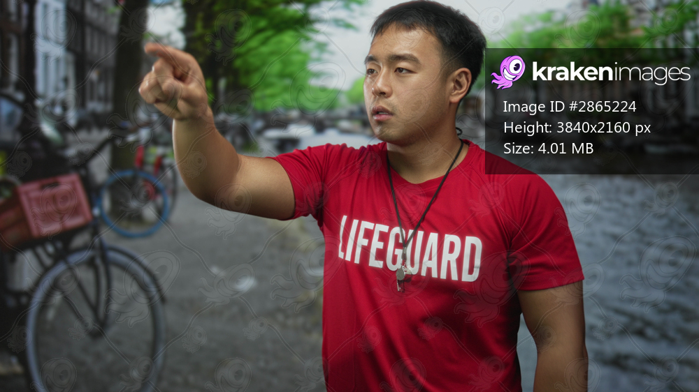 Man in red lifeguard shirt points finger at silver whistle hung around neck on narrow street by canal; vigilance.