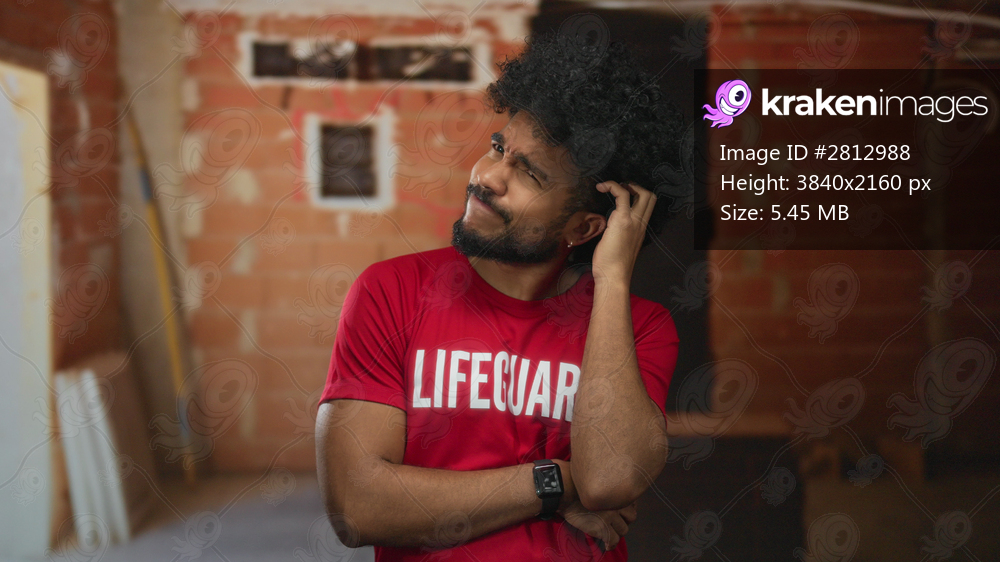 Man in red lifeguard shirt stands indoors pondering at a construction site with brick background, adding a thoughtful element to a unique urban setting. - Kraken Images