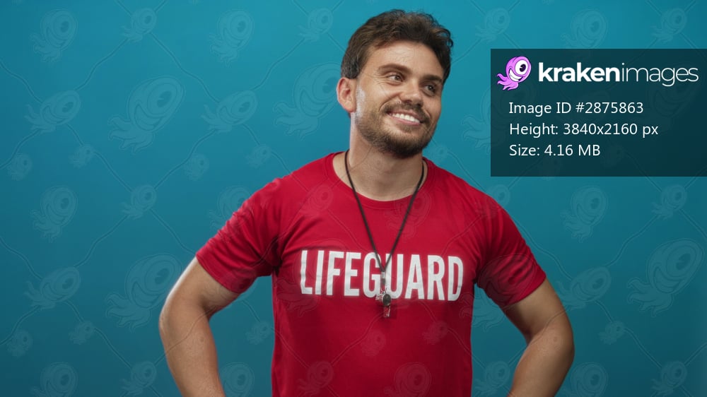 Man in red lifeguard shirt with whistle posing against teal studio wall, smiling with hands on hips; confidence duty.