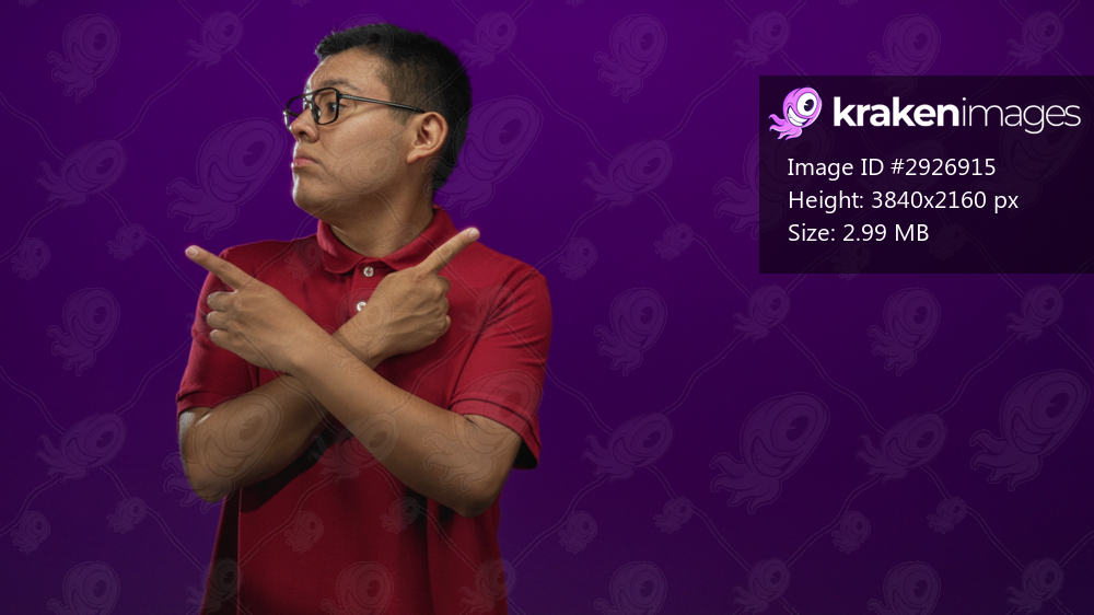 Man in red polo and glasses pointing with crossed arms and index finger in purple studio; rejection doubt.