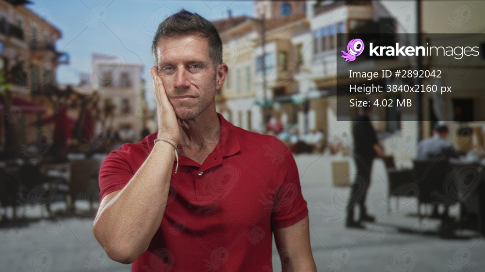 Man in red polo with hand on cheek for toothache in studio hotel interior, eyes closed and pained expression, wrist bracelet visible; toothache pain.