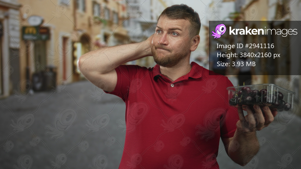 Man in red polo holding a clear plastic container of cherries, hand behind neck on street; hesitation choice decision.