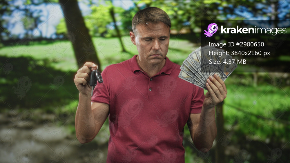Man in red polo holding car keys in one hand and fanning cash with the other in a park; regret financial dilemma.