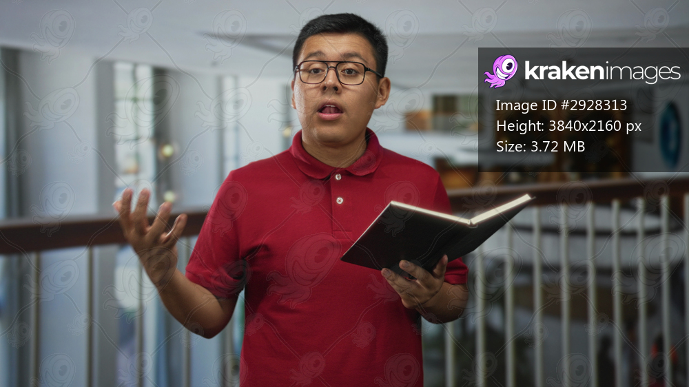 Man in red polo holding notebook with open mouth and hand gesture in hotel building; quiet concentration.
