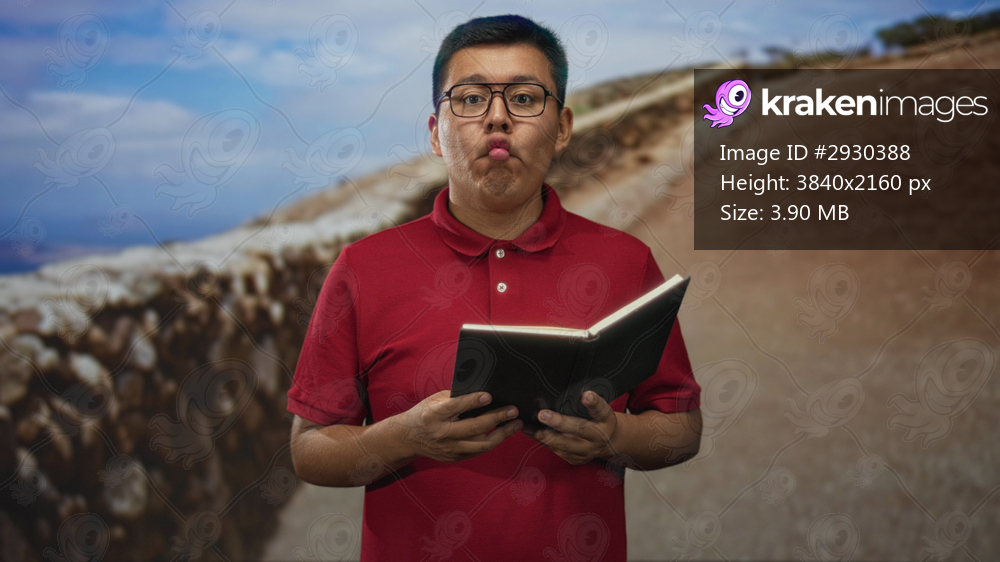 Man in red polo holding open book on a street beside a stone wall, puckers lips while reading; curiosity learning.