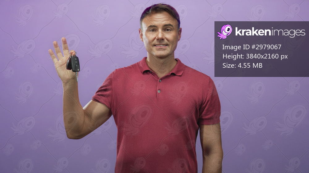 Man in red polo holds car keys aloft between fingers while smiling and looking at them in studio with purple wall; confidence ownership.